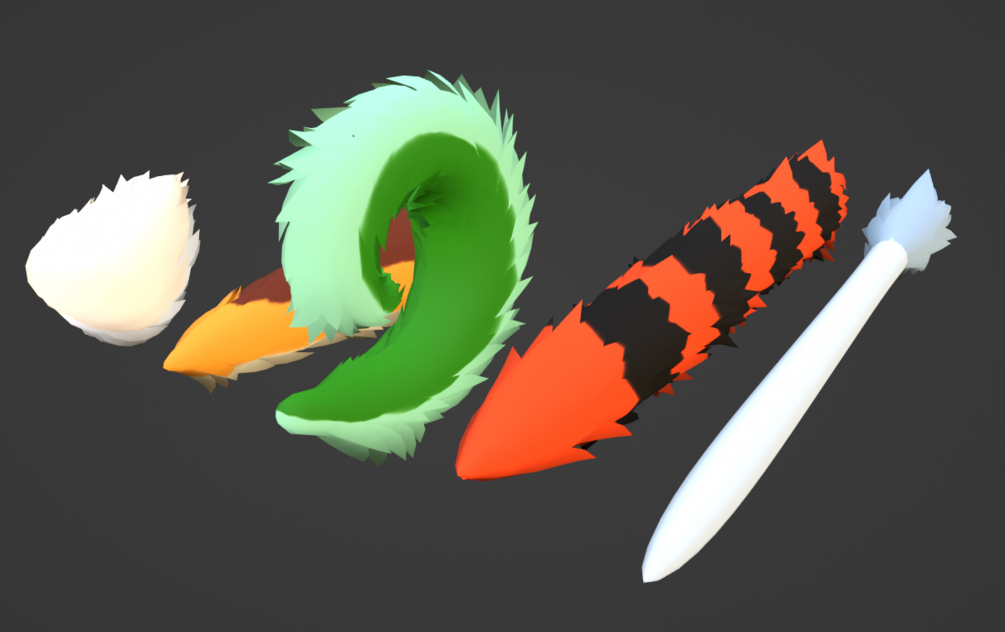 This is a variety pack of 5 tails built for VRChat and VRM applications. It includes the .blend file used to make them, as well as a Unity package with materials and VRChat physbones built into individual prefabs for easy attachment to your avatar.